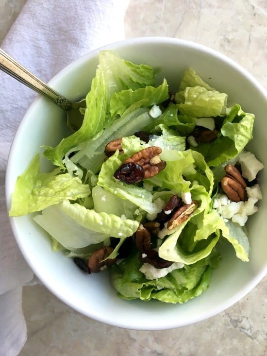 This salad has just the right amount of sweet flavor from the cranberries, intensity from the feta cheese, and crunch from the pecans. I love the blending of flavors and textures in it!
