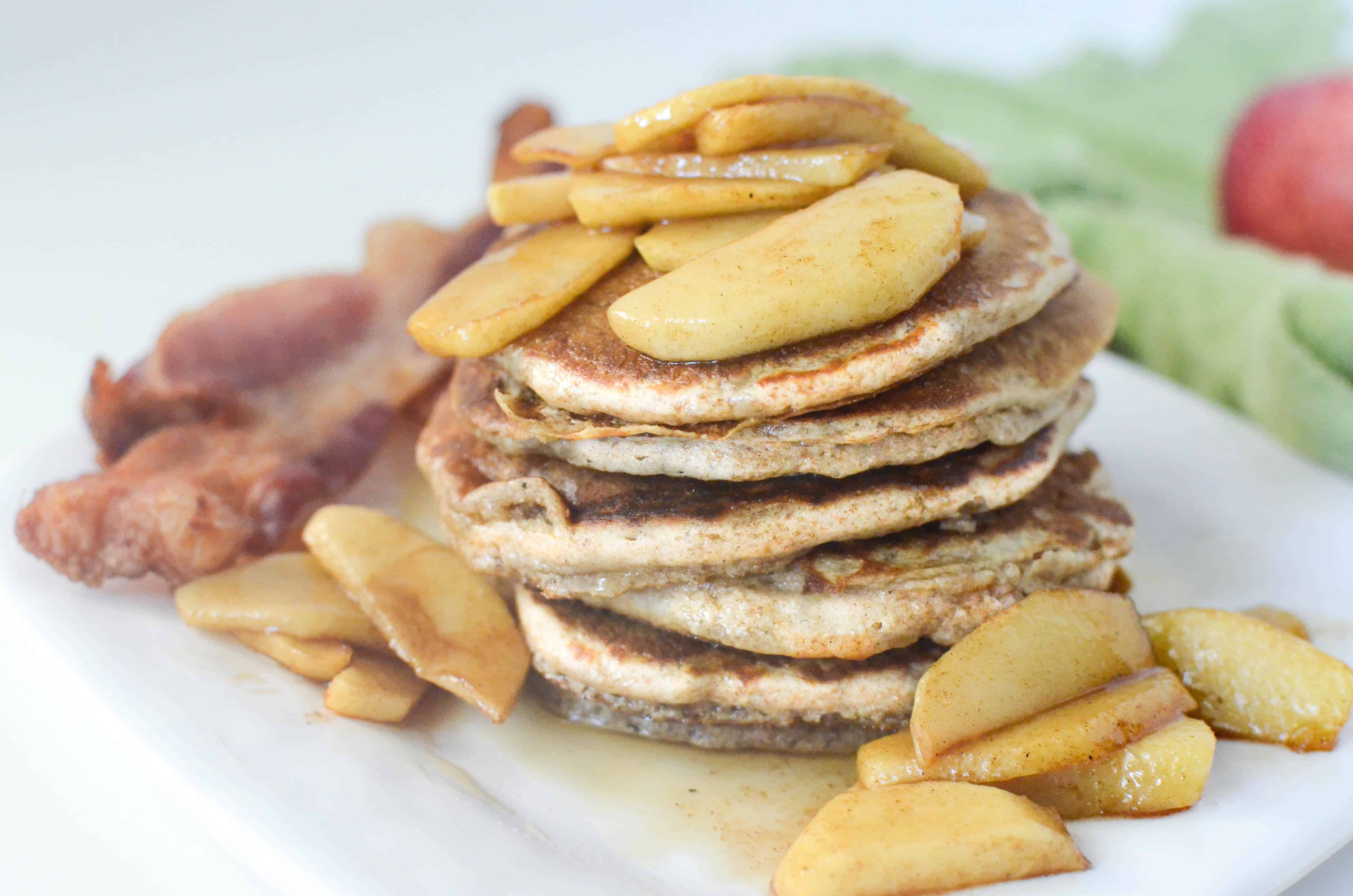 I’m a big fan of serving pancakes with a side of bacon because bacon makes everything better! This breakfast combination of apple pancakes and bacon is sure to hit the spot for your family too!