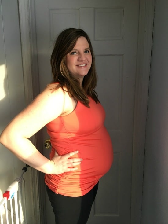 I also want to say that buying actual maternity workout clothes has totally helped me feel more confident and excited to workout too! Last time around I just made what I had work and it did….sort of . This time I definitely felt the need for belly support while working out and have invested in a few favorite workout tops or sized up a couple sizes in sweat-wicking t-shirts. A couple weeks ago I received an awesome maternity workout tank from Mumberry that includes built in belly support! So even if you are rocking a regular-sized workout pant, your baby belly still gets great support, which always helps me feel better about my workout! I loved the top they sent me, especially the bright, poppy-orange color! It oozes mama-baby happiness! (I was sent a top in exchange for my review-all opinions are my own.)