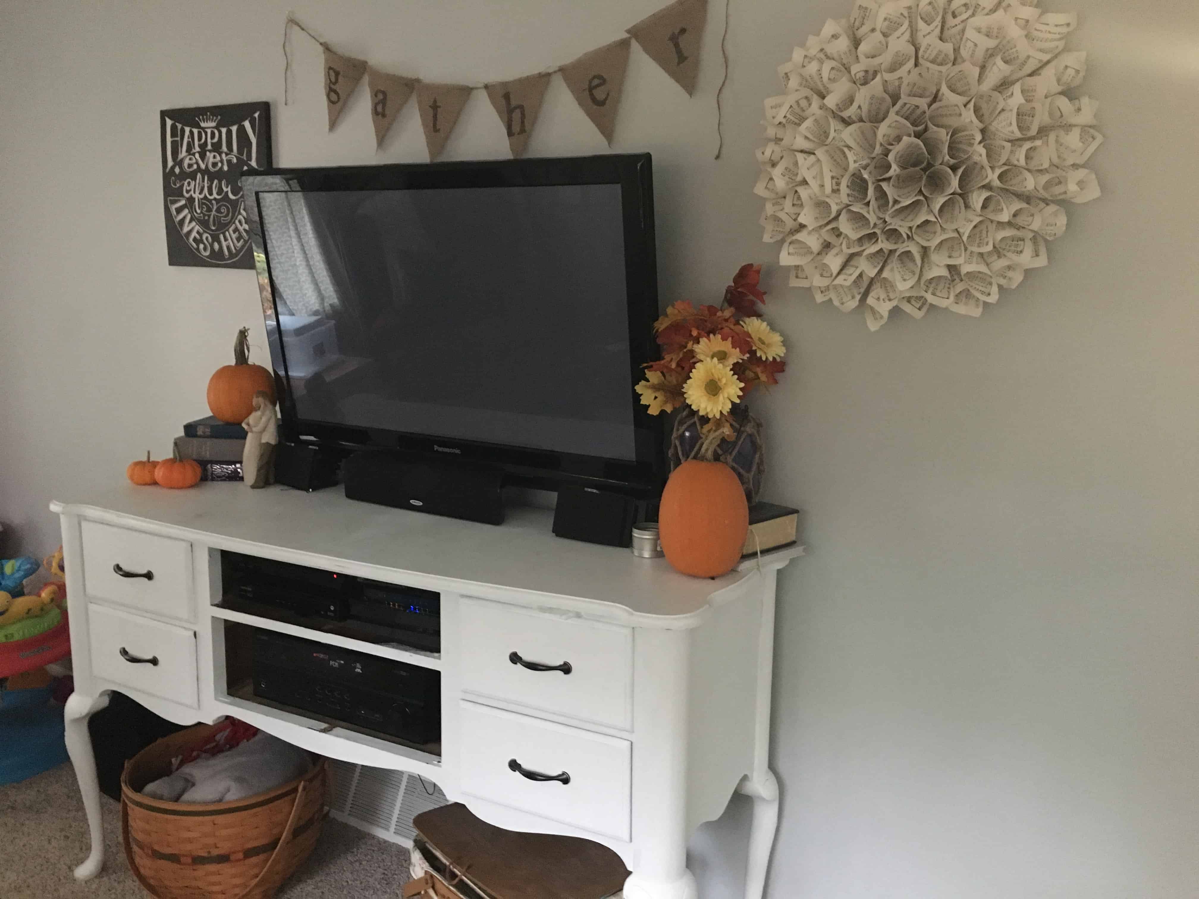 I’m currently in a big redecorating and crafting stage! It’s fun to change up the look of our house, the biggest thing we’ve done is completely reworked our “tv wall” with a new entertainment center (a chalk paint + thrift shop find) and I made the gather banner and music sheet wreath. I’ve also finished up some cute details (constellation art and a antler redo!) in Barrett’s room which were super fun!
