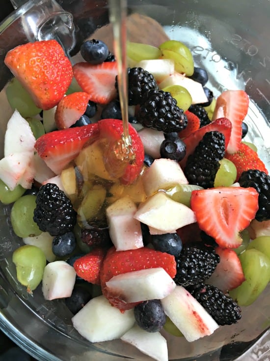 - Add honey, lime zest, and lime juice to the fruit. Stir until fruit is coated.