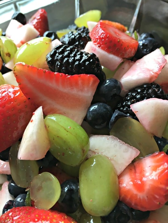 When I was roaming around Meijer thinking about summer and looking at fruit I thought it would be fun to make a red, white, and blue fruit salad. (The grapes are white according to the label. Work with me people.) So this honey lime fruit salad would be perfect for Memorial Day! But please don’t wait that long to make it! It’d make a great Easter side or a fun way to make your french toast or pancakes extra fancy on the weekend.