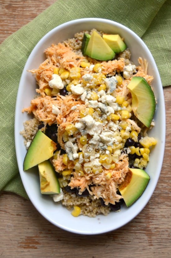 - Buffalo Chicken bowls I just have rice/quinoa, beans, or corn–not all three or eat as a salad.