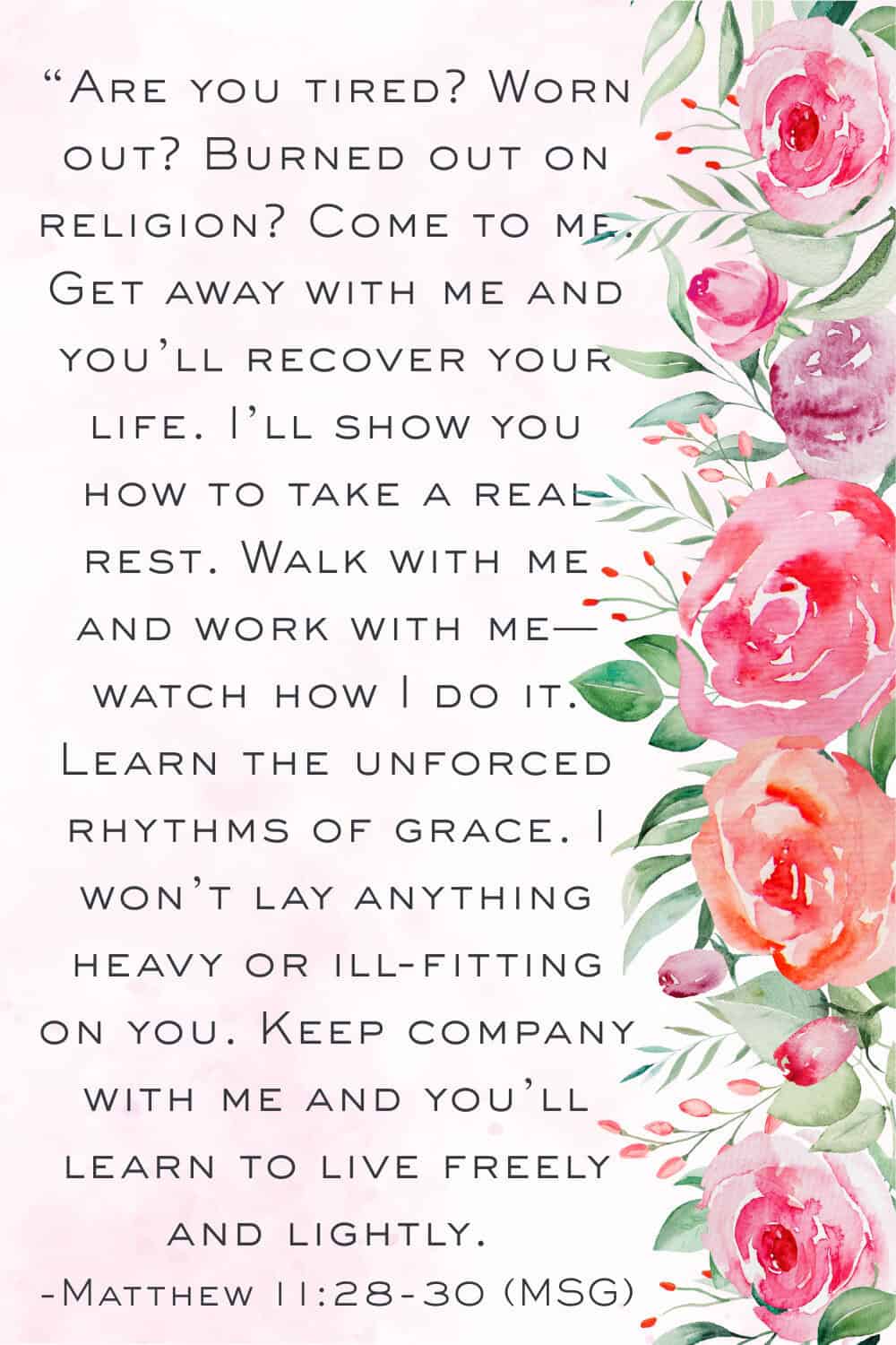 “Are you tired? Worn out? Burned out on religion? Come to me. Get away with me and you’ll recover your life. I’ll show you how to take a real rest. Walk with me and work with me—watch how I do it. Learn the unforced rhythms of grace. I won’t lay anything heavy or ill-fitting on you. Keep company with me and you’ll learn to live freely and lightly. -Matthew 11:28-30 (MSG)
