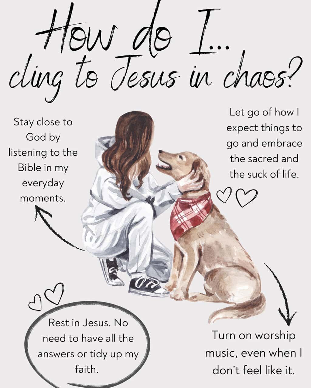 watercolor image of a lady kneeling down as a golden retriever with a bandana looks up at her. Large text at top reads: how do I cling to Jesus in chaos?