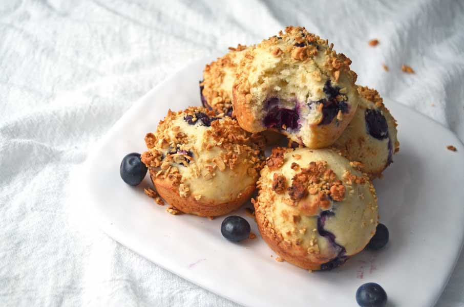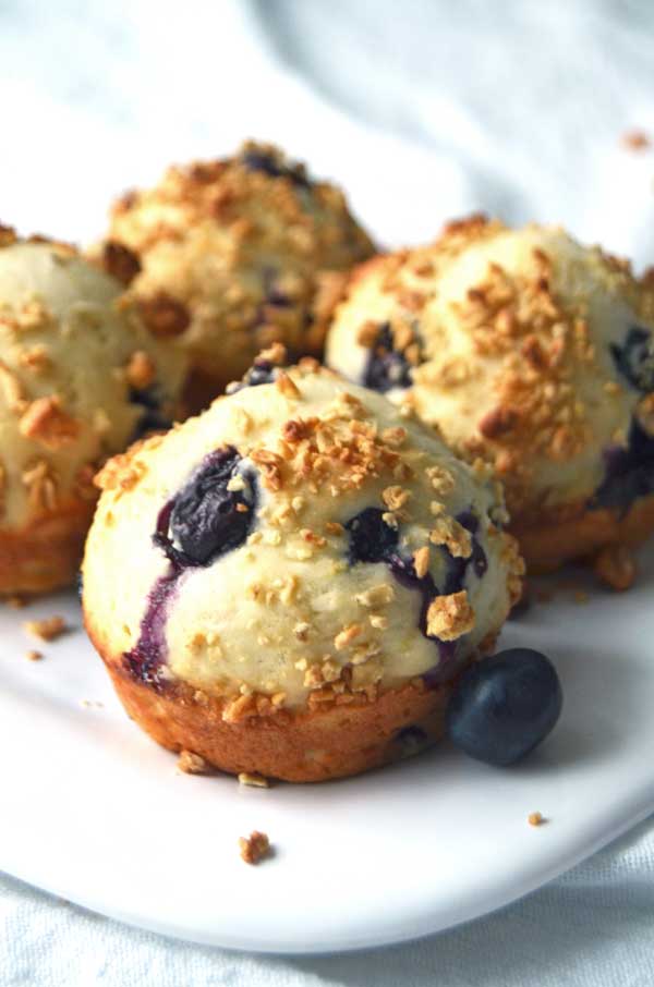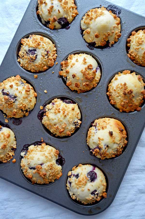For the lemon blueberry muffins I substituted Greek yogurt for some of the original oil to make them a touch healthier. I also reduced the sugar just a bit too. The lemon flavor gives them a pizzazz and elevates them above the ordinary. Also, I love the way my hands smell after grating lemon peel. For a bit of extra texture and prettiness I added a sprinkle of my favorite honey-oat granola on top too.