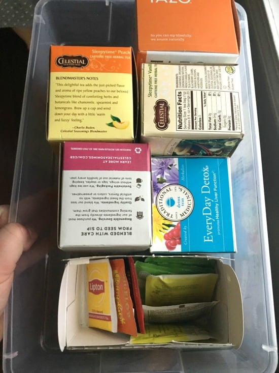 7. Move some families into storage containers to keep them grouped together. I ended up having tea, adult snacks, kid snacks, pasta, miscellaneous baking (chocolate chips, coconut flakes, nuts), and mixes (jello mix, pudding mix, dip packets, etc). I chose all clear containers so I can see what’s what and I don’t need labels. tea organization