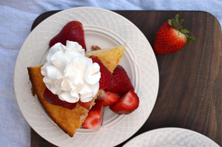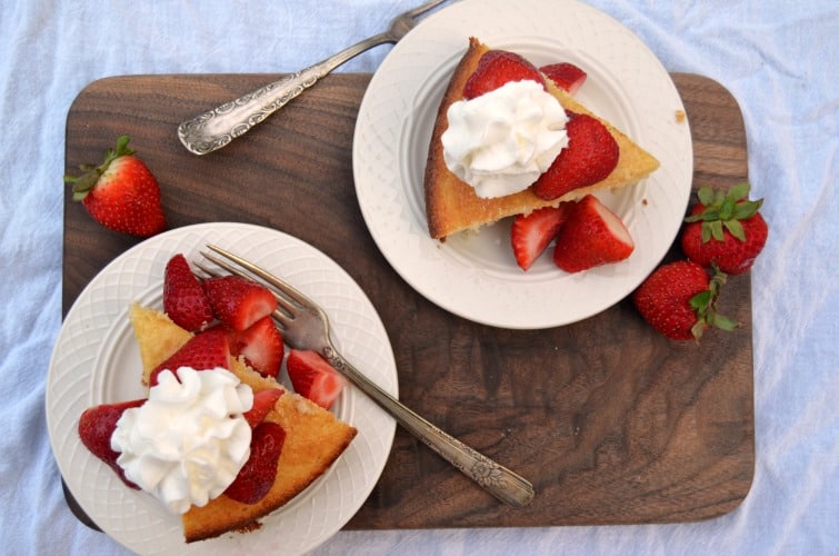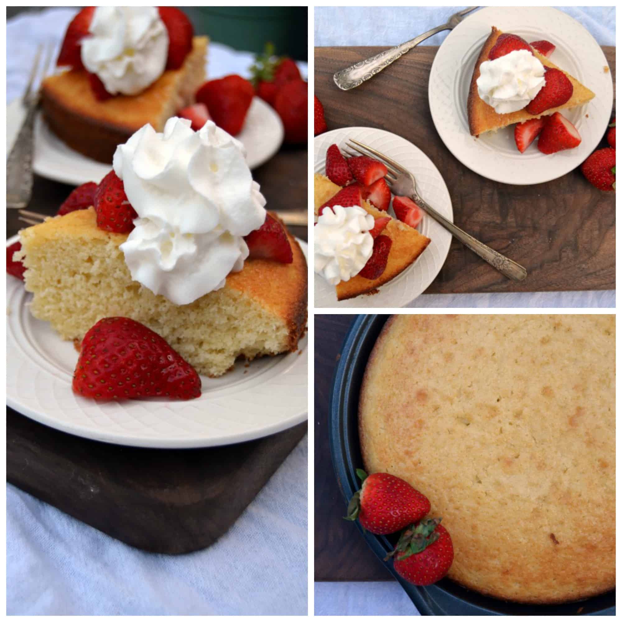 We love this sweet, butter cake shortcake! So easy to make and with common ingredients! It’s great with berries from the store, but even better with fresh, home grown strawberries!