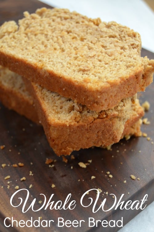 An easy whole wheat beer bread with added cheddar and garlic. Pairs great with a hot bowl of soup!