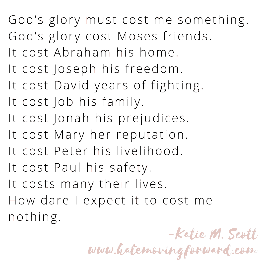 God’s glory cost Moses friends. It cost Abraham his home. It cost Joseph his freedom.It cost David years of fighting. It cost Job his family. It cost Jonah his prejudices.It cost Mary her reputation. It cost Peter his livelihood. It cost Paul his safety. It costs many their lives.